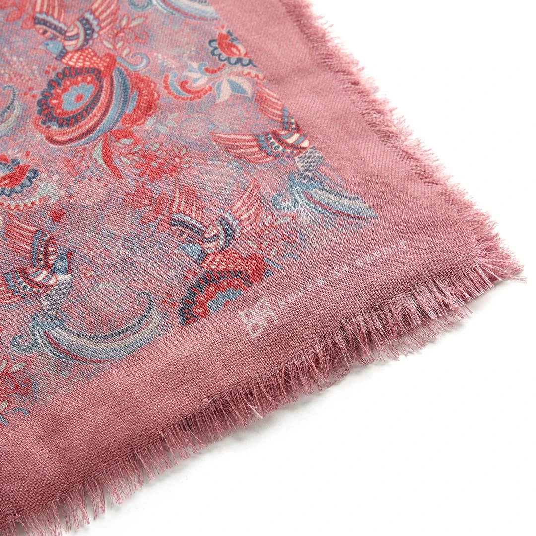Les bords effilochĂ©s et le poids de son tissu confèrent Ă cette Ă©charpe un caractère luxueux. Son motif imprimĂ© très dĂ©taillĂ© (reprĂ©sentant un enchevĂŞtrement d’oiseaux et de fleurs) lui donne un charme rĂ©tro adaptĂ© Ă toutes les saisons.
